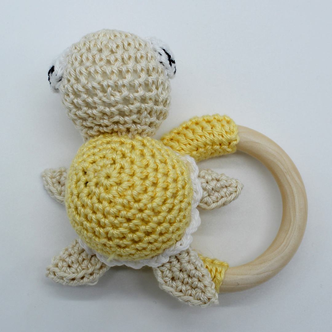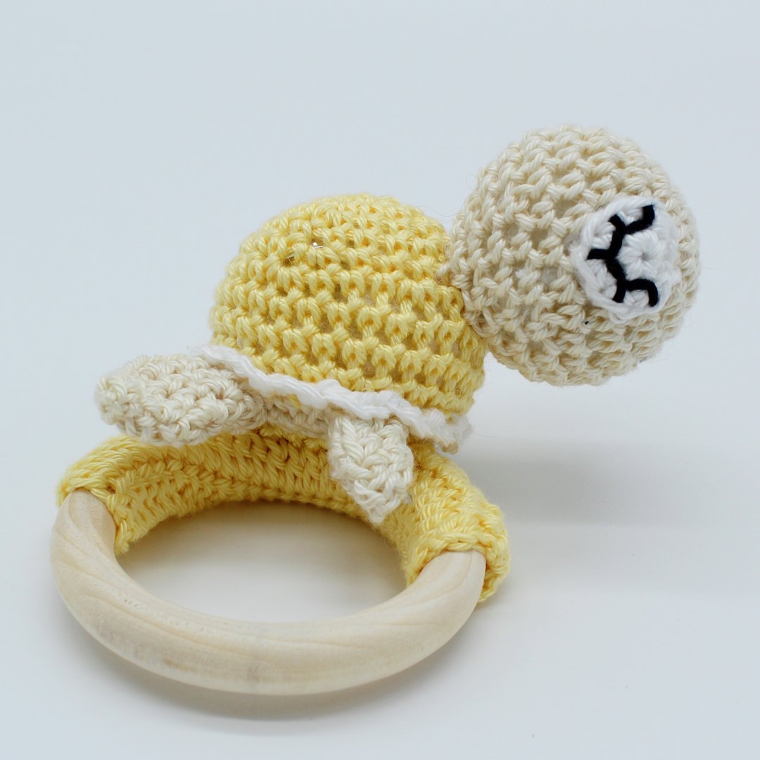 Sonajero crochet de algodón y madera para bebé – Tortuga amarillo pastel